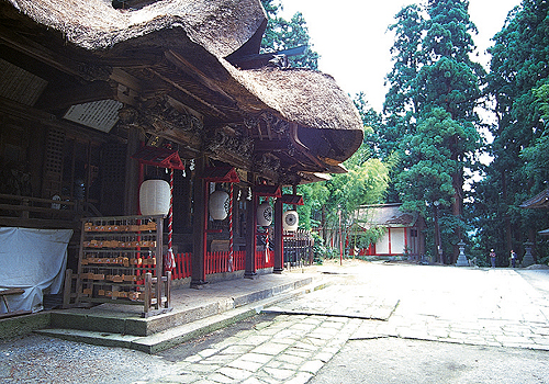 大同元年(806)建立。東北のお伊勢様とよばれる。茅葺きの本殿や参道のイチョウの古木はみごと。
