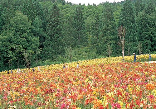 緩やかな丘陵地帯にスカシユリなど約150種50万株のユリを栽培。彩り鮮やかなユリが鑑賞できる。
