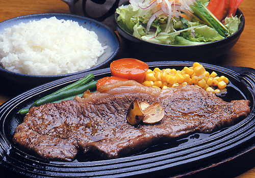 契約農家が丹精込めて育てた甘味のあるサシがたっぷり入った特選米沢牛のサーロインステーキ3990円が味わえる。