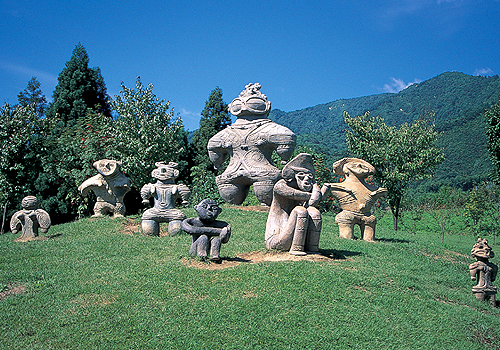 縄文時代の長者屋敷跡を整備した公園。大きな土偶のレプリカや宿泊できる竪穴式住居がある。