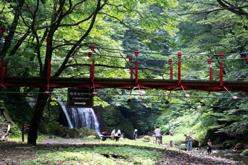 最上川に流れ込む相沢川上流の十二滝も見逃せない。赤いつり橋と滝の景観が美しく、川原に下りて滝がつくりだすマイナスイオンを浴びて川遊びができる。