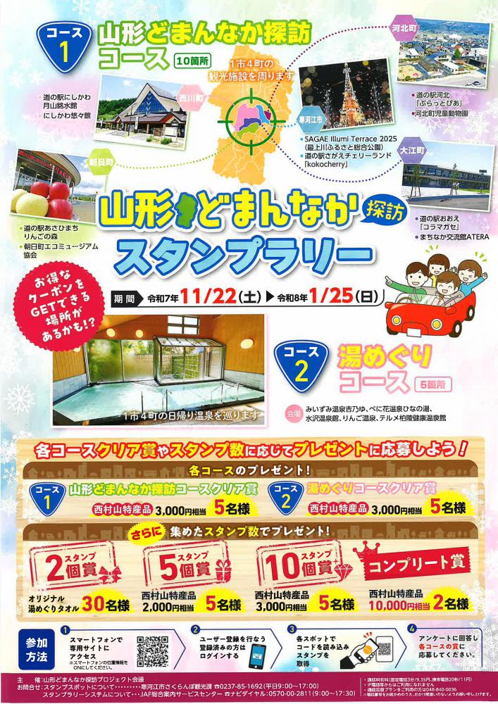 »³·Á¸©¤ÎÃæ¿´¤Ë°ÌÃÖ¤¹¤ëÀ¾Â¼»³Ãϰè¡Ê´¨²Ï¹¾»Ô¡¢²ÏËÌÄ®¡¢À¾ÀîÄ®¡¢Ä«ÆüÄ®¡¢Â繾Į¡Ë¤Ç¡¢ÅߤÎÌ¥ÎϤòËþµÊ¤Ç¤¤ë¡Ö»³·Á¤É¤Þ¤ó¤Ê¤«ÃµË¬¥¹¥¿¥ó¥×¥é¥ê¡¼¡×¤¬³«ºÅ¤µ¤ì¤Þ¤¹¡ª´ü´Ö¤ÏÎáÏÂ7ǯ11·î22Æü(ÅÚ)¡ÁÎáÏÂ8ǯ1·î25Æü(Æü)¤Þ¤Ç¡£