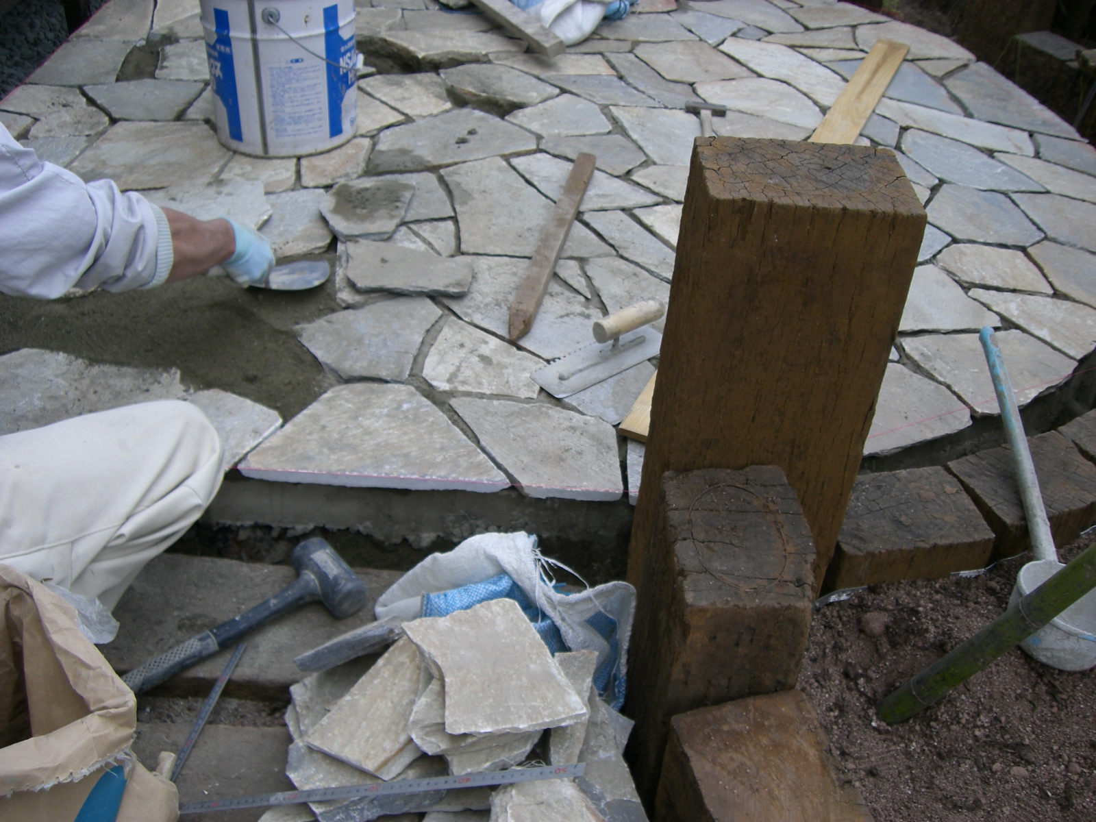 乱張りの風景です。材料をその場で貼っていくぶっつけ本番です。まるでジグソーパズルです。春なのに気温が低くて職人さんも大変。がんばって〜!