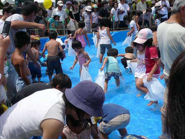 水まつりのお楽しみのひとつ、魚つかみ大会の様子。主催者の想像を超える人出にびっくり!