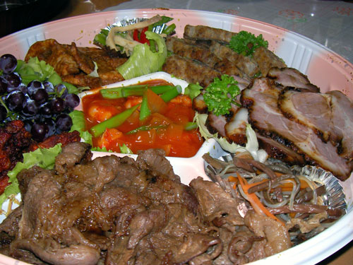 全9品が入っています。以前、紹介した特製焼き豚を始め、牛焼き肉、豚肉の味噌焼き。写真右奥の四角いものはハンバーグ的なお味でした。真ん中にエビチリがのって、チョー満足。うちは、6人でごちそうになりました。