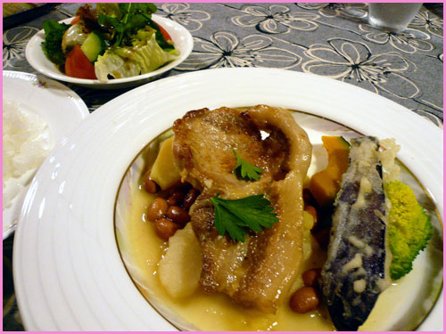 さて、なび研のもうひとつのお楽しみがレストランジュアンのディナーです。今回は「ブーランジュール」という豚肉メインの料理です。昔、町の一般の人の家に大きな釜がなかったころに、パン屋の焼き釜の残り火を利用して、焼いたのが、この料理の由来だそうです。