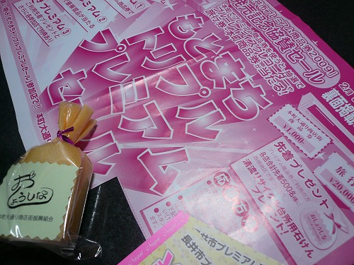 末広と梅村呉服店の2店で利用(各1,000円以上)し、スタンプをもらい、ブルーレイディスクが当たるサービスに応募しました。家で広告の右下の部分をしっかり切り取って。