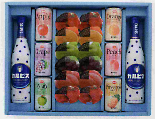 カルピス450ml×2、ポンドリンク・オレンジミックス、アップル、うめ、パイン、グレープ、ピーチ各190g×1、ゼリー・ストロベリー63g×4、ピーチ、グレープ、アップル、オレンジ各63g×2