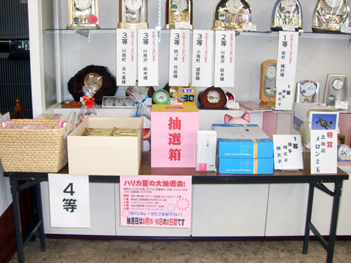 日頃より当店をご利用いただきありがとうございます。本日のハリカ夏の大抽選会の準備が整いました。昨日1等(博多紀久屋無着色辛子明太子)が1本、2等(ファミリードリンクギフト)1本、3等(当店優待券)は4本出ました。おめでとうございます。特賞(北海道メロン2玉セット)目指して、チャレンジしてください。ご来店お待ちしております。