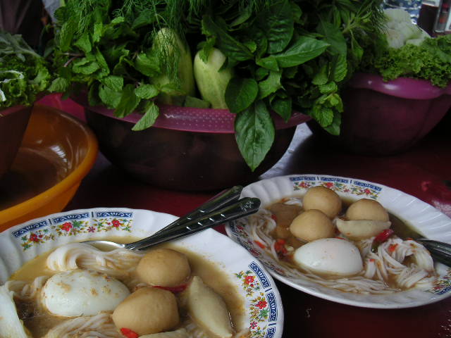 テーブルの上に、バジル(スイートバジルよりもだいぶえぐみがある)やら、皮をむいて輪切りにしたキュウリやら生のモヤシやら…が山盛りに置いてあり、自分で好きにトッピング。