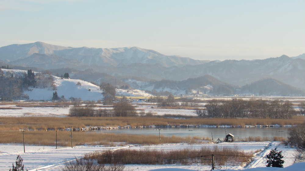 ▼昨日は朝から好天で夕方には一面がオレンジ色に染まりました これからはなかなかこのような天候に出会えなくなるだろうと急いでカメラを向けました 白竜湖の周りには枯れた葦や葦が雪からニョキニョキと飛び出し早春を思わせる風景です 夕日に照らされた東の山並みの奥に蔵王ではないかと思われる真っ白な山が輝いています つかの間の好天です 今日からまた冬に逆戻りしそうです