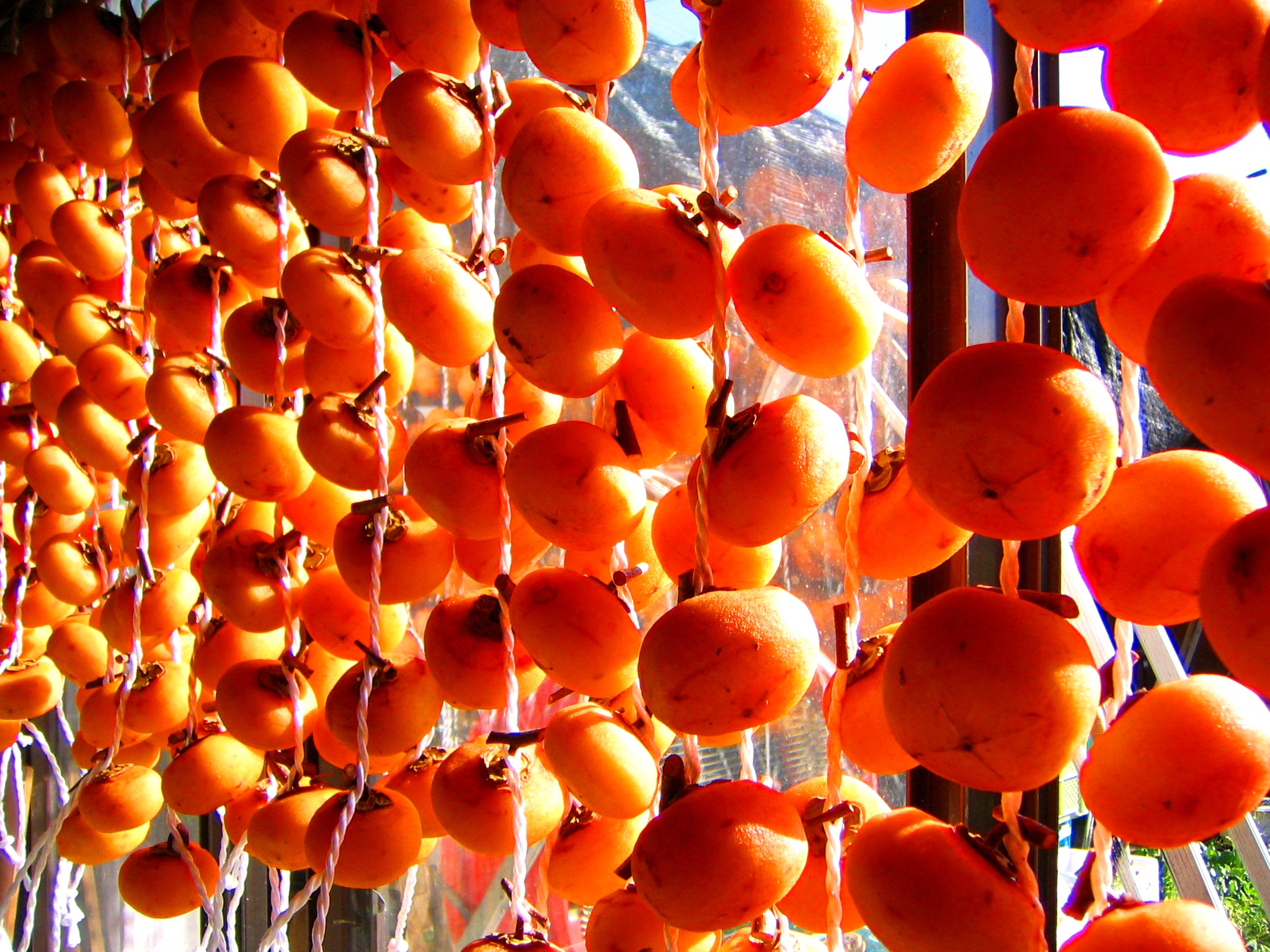 作業場の窓際に垂れ下がった柿、柿、柿。