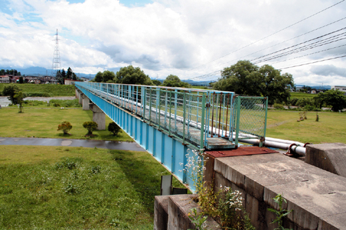 糠野目水辺の楽校の敷地内に、最上川を横断する180mの水管橋がある。いまから210数年前、ここは幅7尺・深さ3尺の木の樋が川を渡る、長さ70間もの黒井堰の水路だった。