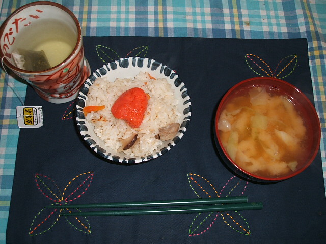 昨日の残りの炊き込みご飯に最後の明太子をのせて!
