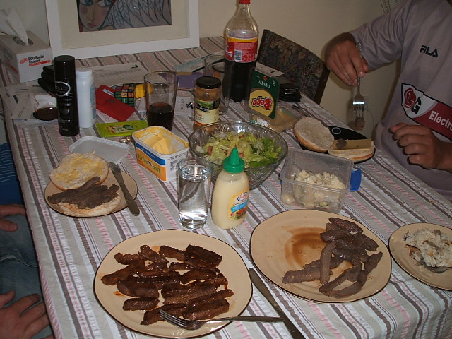 サラダ、昨日の残りのポテトサラダも。肉の味付けが和風なので私はまたまた残りの炊き込みご飯と食べましたが、フィルと弟のジョナサンはパンにはさんで。