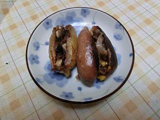 小型のアケビにいろいろな具を詰めて油て炒めて
