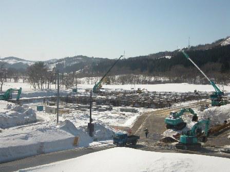2台のクレーンとともに、除雪をしながら足場を組立ます。