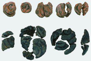 押出遺跡からなんとクッキー状の炭化物が出士しました。士器の装飾と同じ渦巻きの模様がついています。調査後、脂肪酸分析という方法によって、クリ・クルミ・イノシシなどの肉・血・野鳥の卵が含まれている事が分かり、縄文時代の高カロリー食品として注目されました。炭化物がついた石皿も見つかっており、加熱した石皿でクッキーを焼いたと考えられています。