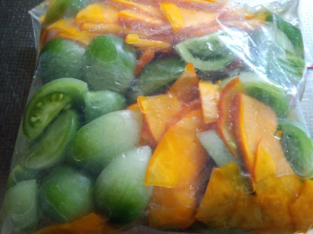 近所の方より・・・・かぼちゃの仲間“コリンキー”を頂き、ピクルスを作りました(^。^)v今回は、美蔵のトマトが熟さずごろごろいっぱいあるので「青トマトとコリンキーのピクルス」にしてみました。甘酸っぱくて・・・・かりかりしておいしいですょ〜ぜひ、おためしあれ