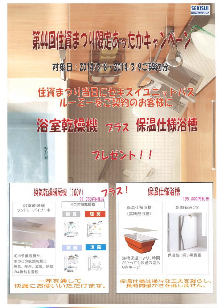 ツイッターで告知していましたとおり、毎年恒例☆住資まつりの時期がやって参りました! ☆ 2014年 第44回住資まつり ☆日時: 平成26年3月8日(土)〜9日(日) AM10:00〜オープン!開催場所: 山形県観光物産会館 (山形市蔵王68番地) ユニットバス・システムキッチン・トイレ・洗面化粧台じゃんじゃん展示しております!こちらに添付した画像のとおり、ユニットバスは今がお得です ヽ(*´∀`)ノ 住資まつり当日にセキスイユニットバス ルーミー をご契約してくださったお客様に 浴室乾燥機(91,350円相当) と 保温仕様浴槽(105,000円相当) を プレゼント しております!!合わせると・・・196,350円相当!!ひえ〜ヽ( ゚д゚)ノ 他にもたくさん展示品はございますので、お気軽にお越し下さい ^^今のお風呂ってどういう感じか気になるわ〜というお客様もいらっしゃるかと思います。ご自身の目でお確かめ頂くだけでももちろん結構です^^*是非 是非 、ご家族の方もお誘いのうえお気軽にいらしてくださいませ♪カタログで品物を見るのと、実際に実物の品物を見るのは、やはり違いますからねっ♪ 暖かいお飲み物や粗品をご用意して、 皆様のご来店を心よりお待ちしております \(^^)/