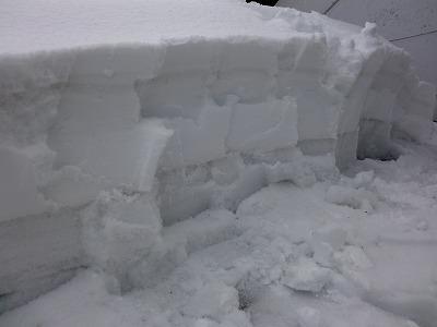 屋根に上がって見てびっくりです。先日も書いたように今年の雪は ドカッと降っていい天気の降雪状態が続きました。それを如実に示す積もり方です。圧雪状態で何重にも雪の層がみられます。1mはありました。筋肉痛が続いています。屋根の雪下ろしは除雪機では無理なんですよね、もう少し続きそうです。