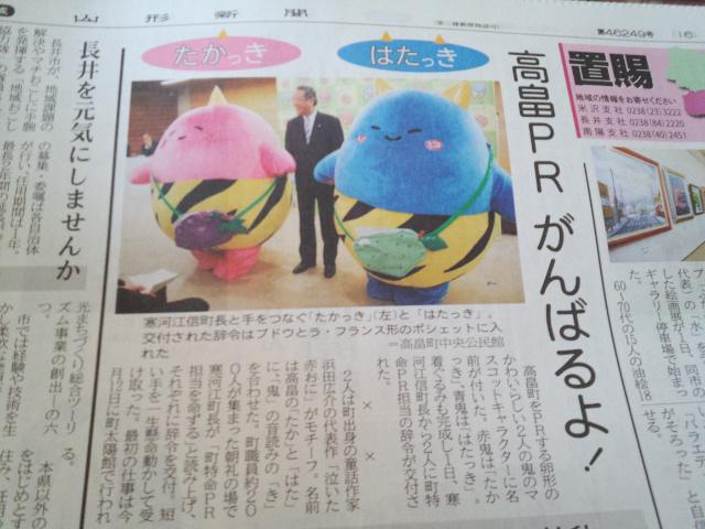 今日の山形新聞に高畠町のゆるキャラが紹介されました。「はたっき」「たかっき」と言うお名前ですょ〜まんまるで可愛いですよぇ〜ね今度、実物にあったらアップいたします(#^.^#)vお楽しみに!!