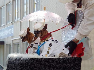 大河原町の1目千本桜祭りで来かけた名物のワンちゃん今回は水兵姿でした。なかなか堂に入っていますね季節により 着物を着たりいろいろと お色直しをして散歩しているそうです。テレビにも時々取り上げられているワンちゃん夫婦です。