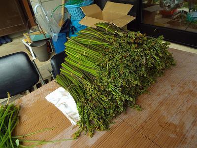 4人で25キログラム 写真は山分けして13キログラムでした。食べる分はあく抜きし 残りは塩蔵しました。そろそろわらびも終焉かと思われます。ついでに、青ミズナも採取してきました。おひたしや漬物に入れて食べます。初夏の味です。本日の高畠今にも雨が降りそうな曇り空です。