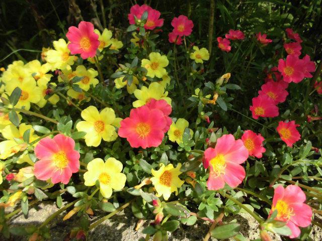 今日もあっちぇ高畠町ですが・・・・今、車の温度計が36℃くらいでした(−。−);どうりであっちぇはずです。こんな暑さに負けず美蔵の庭の花壇で「ポーチュラカ」が元気に咲いております。赤に黄色に白・オレンジとコスモスの間に咲き競っておりますょ〜(^。^)v