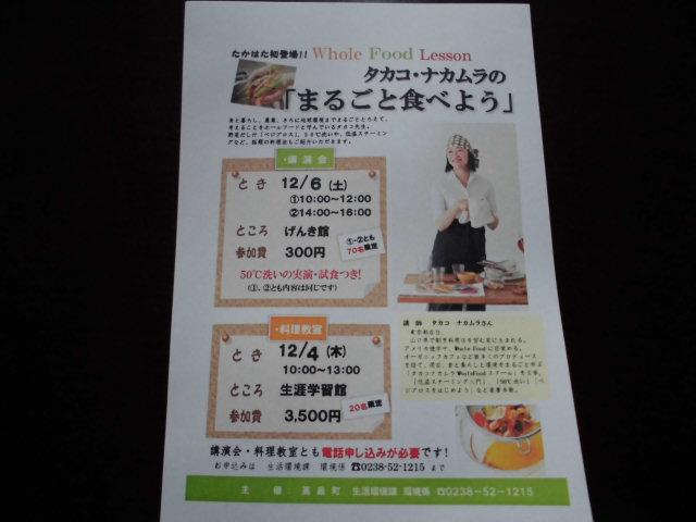 先日(12/6)、高畠町に初登場!!whole food Lessonタカコナカムラ先生の講演会が行われ、参加してきました。野菜だし汁「ベジブロス」・50℃洗いの話題の料理」法を紹介されました。以外に知らないことがいっぱい!!改めて勉強になりました(^。^)v