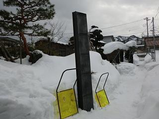 スノーダンプと雪下ろし滑り台スノーダンプは自分用の大きさと家内用の小型を使い分けます。立ててある黒いものは屋根の奥の雪下ろしの時に使う雪の滑り台です。ここの所いい天気ですがいつ寒波が来てもよいように準備しています。