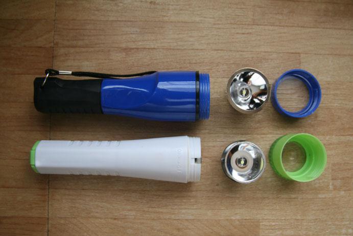 ダイソーのは通常の樹脂ボディ(色は青と赤の2種類あったように思います)ですが、シルク/ワッツ扱いのものはレンズ周囲のパーツに蓄光樹脂が使用されているようで、暗くなると薄緑に光るようです。(蓄光樹脂の関係か、ボディカラーは緑のみ)