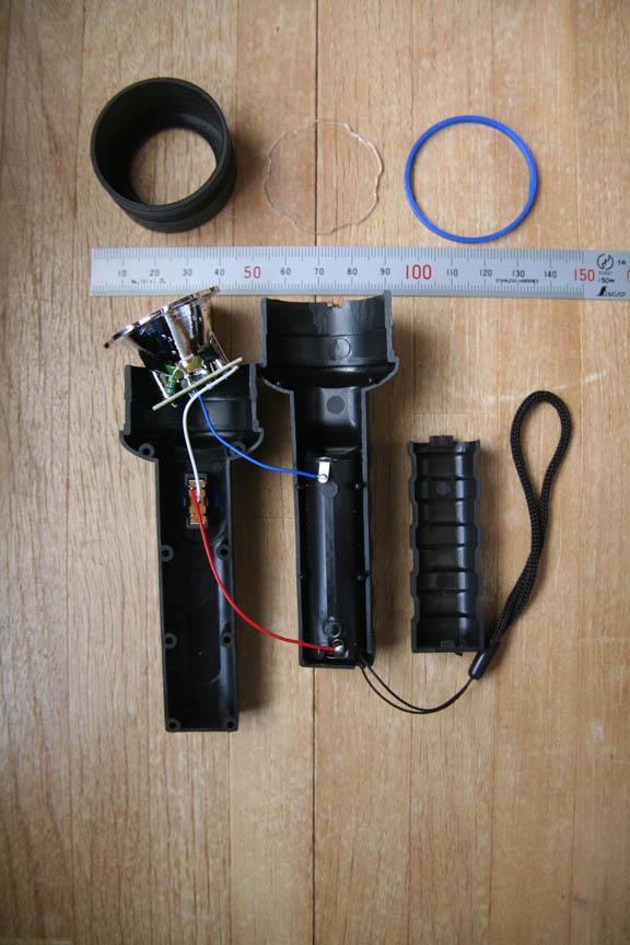 LEDヘッド基板はカバーとは分かれているが、スイッチや電池ケースからの配線が伸びています。(分解する場合は配線を引きちぎらないよう注意が必要)