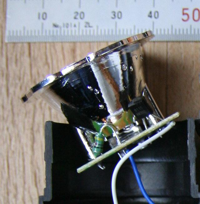 これらのライトに使用されている大型のLEDは発光面の樹脂表面が平坦であり、直径方向に電極が見える構造のものが使用されています。レンズ面から覗き込むと従来の直径5mmタイプのLEDが使用されているものとは容易に区別が付くと思います。