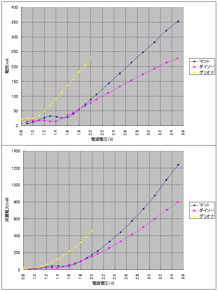 グラフ上は消費電流特性,グラフ下は消費電力特性。