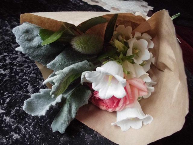 先日、お客様より素敵な「花束」をいただきました(^。^)vピンクのローズと白妙菊・たぶん?バニーテールなどなど心のこもった「プレゼント」にただただ、嬉しいです。さっそく、クラフトバンドのバスバスケットに飾らせていただきました。本当に、ありがとうございました。