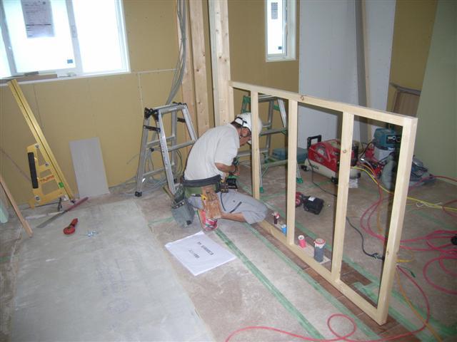 当現場では、ダイニング側にも棚が取付くので薄い下地で壁がを作成となります。