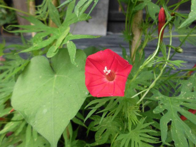 いつの間にか?グリーンカーテンの「ルコウ草」が真っ赤な花を咲かせてくれました(^。^)v一か月半位で可愛いく咲いてくれました。お花を植えてくれた「宿泊体験学習の生徒さん」にご報告でした(^。^)vありがとうございます(^^♪