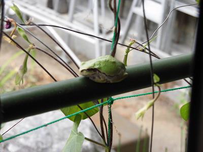 昨年と同じ来訪者かは不明ですがいくらかふっくりと一回り大きくなったようです。窓際の朝顔の棚に乗っかって虫を待ち構えているようです。昨日、今日と涼しい朝で蝉の声は消えてしまいました。変わってコオロギと鈴虫のさわやかな音色が心地いい朝となっています。