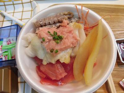 青森、八戸、横浜、江の島、鎌倉を巡りグルメ中心の食道楽の旅行でした。まずは青森のノッケ丼です。チケットを購入し店内の魚屋から好きな具材を調達しオリジナル海鮮丼を作って食べます。4人の事例です。