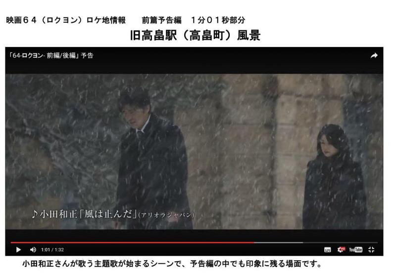 映画64(ロクヨン)情報2「64-ロクヨン-前編」の冒頭シーンは、高畠町の旧高畠駅舎で撮影が行われました。 予告編の1分01秒の所で映像が流れます。ちなみに0分59秒の所はJR今泉駅の線路の映像です。小田和正さんの主題歌が始まるシーンですので、予告編の中でも印象に残ります。上映は、5月7日(土)より全国の映画館にて上映されます。