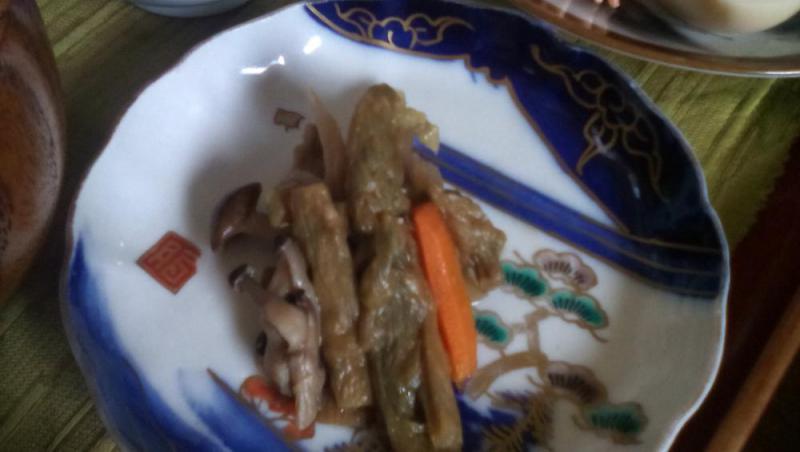 今日の煮物は、「アスパラガスの干し物」です。手間暇かけて干し物にして時間をかけて戻します。なかなか、他では食べれない一品です。