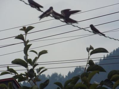巣立ちの準備でしょうか朝になるとどこからともなく庭の電線に集まってきます。よく観察してみると親ツバメが定期的にえさを運んで口移しで食べさせています。餌やりの順番が心配ですが偏らないものなんでしょうか
