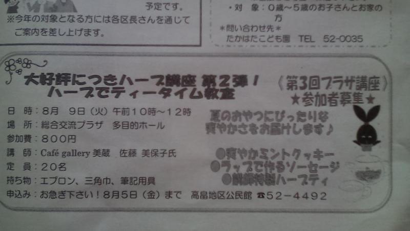 6月のハーブ寄せ植え教室にご要望がありました。ハープを使った料理ということで……第三回プラザ講座 ハープ講座第二弾として ・ 爽やかミントクッキー ・ ラップでつくるソーセージ ・ハープティー 日時 8月9日(火) 時間 10時〜12時 参加費 800円8月5日(金)まで 高畠地区公民館 ?52-4492まで ご希望のご連絡ください。お待ちしております(^_-)-☆