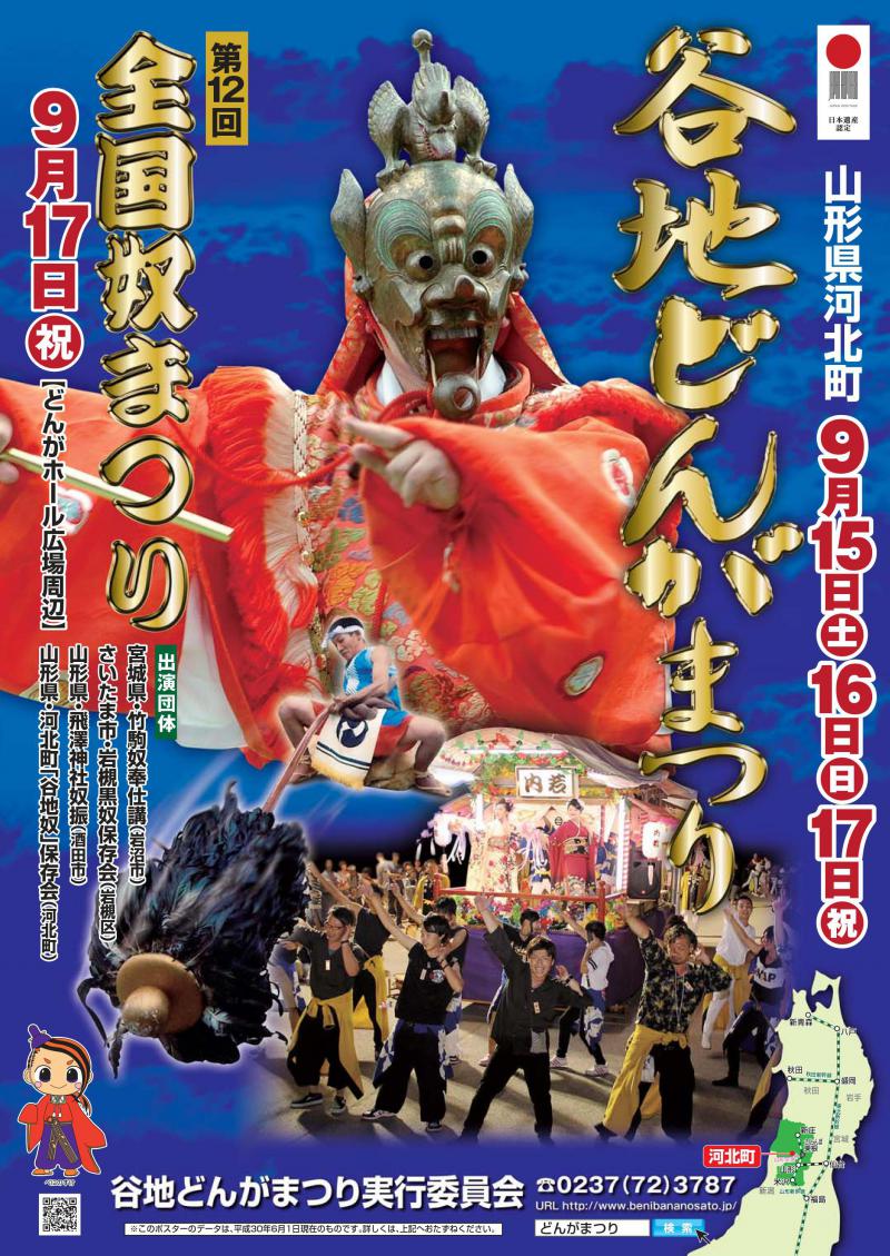 2018年の谷地どんがまつりは、第12回全国奴まつりとともに、9月15日(土)16日(日)17日(祝)開催です! 例年通りのまつりのみどころに加え、今年は新たなこころみとしてリアル謎解きゲーム【べにのすけと不思議な手紙】というイベントも開催します。厳かな林家舞楽とあでやかな囃子屋台、さらに、力強い奴振りの静と動が織りなす谷地どんがまつりに、ぜひ、いらしてください。 ◇まつりのみどころ◇15日・谷地八幡宮境内での林家舞楽紅染めの衣装やかがり火が灯る夜の清浄な闇の中で厳かに行われる夜遊の舞です。(会場、谷地八幡宮)16日・御神輿還御の行列、谷地奴奴の勇壮な振り姿とユニークな掛け歌は楽しさ満載です。さらに、谷地八幡宮の鳥居をくぐる瞬間は必見です。(会場、谷地八幡宮)17日・全国奴まつり、囃子屋台の競演4団体の個性豊かな奴が出演します。また、町内一円を3日間練り歩いた囃子屋台がどんがホールにて一堂に会してのお囃子と歌踊りは圧巻です。(会場、どんがホール広場周辺) お問い合わせ先山形県河北町商工観光課:0237-73-5162(一社)河北町観光協会:0237-72-3787谷地八幡宮:0237-72-2149 かほくべに花おとめのインターネットラジオ「やっしょまかしょ かほくべに花おとめの聞いてけろ来てけろラジオ」にて、どんがまつりについて谷地八幡宮神主・林重紘さんよりお話ししていただきました。