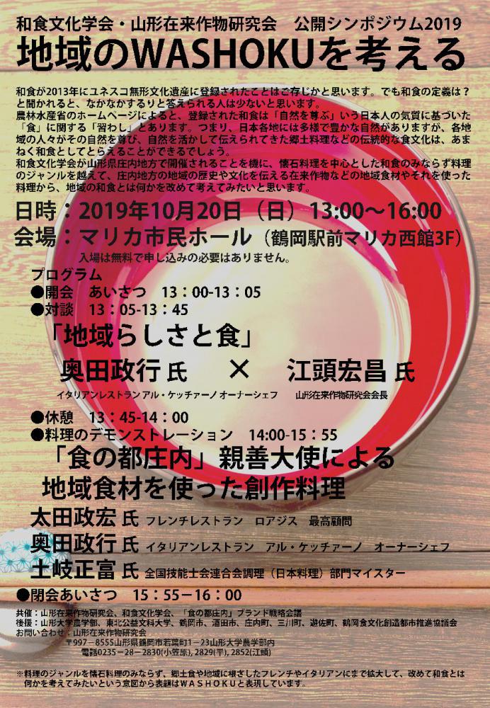10月20日(日)13:00-16:00 山形在来作物研究会 公開シンポジウム「地域のWASHOKUを考える」を実施します。山形在来作物研究会会員だけでなく、一般参加も無料で、予約の必要もありません。