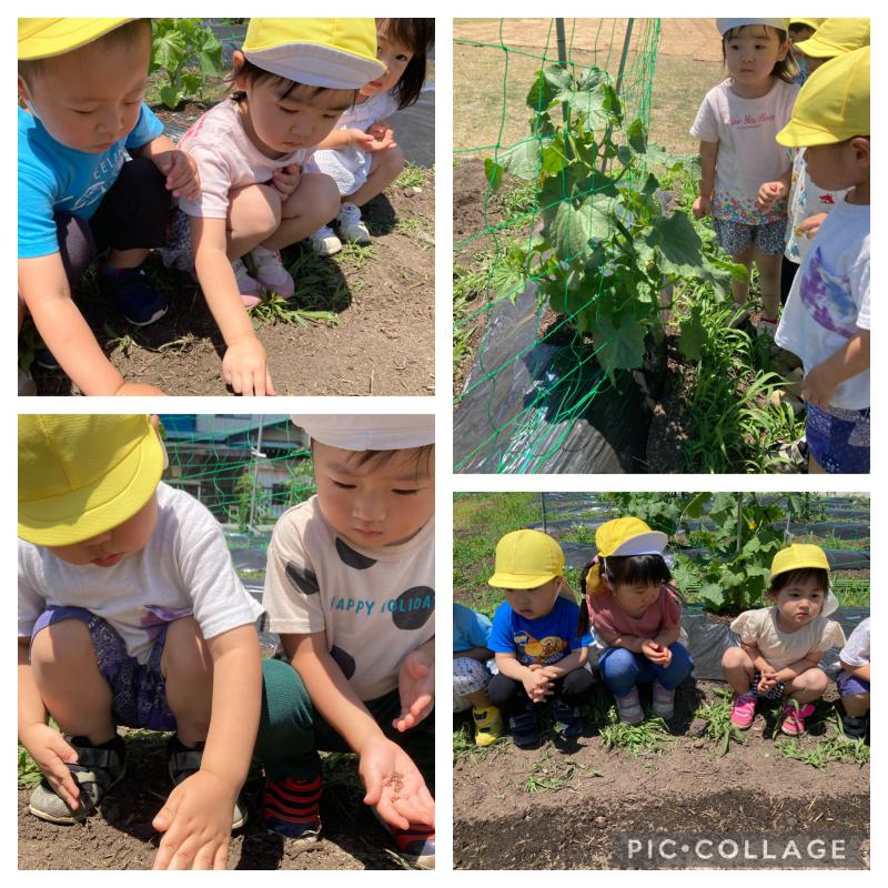 にじいろ畑にはつか大根を植えました。その後、どんな野菜があるのかみんなで探索。『なすー!』『きゅうり!』と嬉しそうに教えてくれました。これからの生長が楽しみです。
