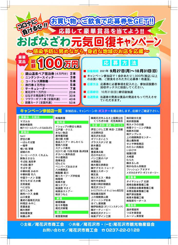 【キャンペーン期間】 9月27日(月)〜10月31日(日)【内 容】 @キャンペーン期間中、キャンペーン参加店にて1会計当たり1,000円(税込)以上の買物・飲食等を行った方に応募券を1枚進呈 A応募券に必要事項を記入の上、キャンペーン参加店に設置の回収ボックスに投函 B後日、応募申込みの中から抽選で総額100万円相当の豪華景品が当たります