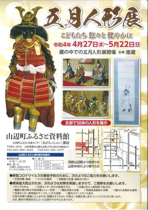 ふるさと資料館では、「五月人形展」を開催しています。歴史ある鎧や兜、勇まし人形の数々、掛け軸など展示しています。子供の成長と健やかな健康を願い飾られきた五月人形の数々をぜひご覧ください。 『五月人形展』日時:令和4年4月27日(水)〜5月22日(日) ※月曜日、祝日(こどもの日は除く)は休館時間:9:30〜16:30場所:ふるさと資料館南蔵入館料:大人200円 高校生・大学生100円 小中学生50円(未就学児は無料)お問い合わせ先:ふるさと資料館 TEL023−664−5033