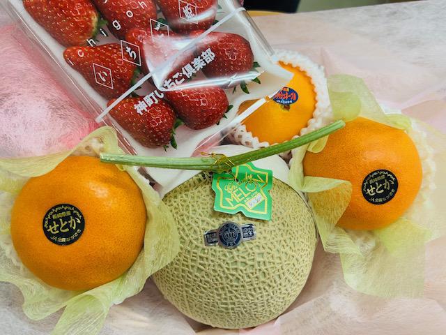 ご退職の贈り物のオーダーにお応えして・マスクメロン最高級クラウン(静岡産)・せとか(長崎産)・デリッシュネーブル(愛媛産)・いちご姫Deluxe(山形産)ピンク色のシフォンのリボンで仕上げました。「長い間お疲れ様でした」のお気持ちが届きますように。